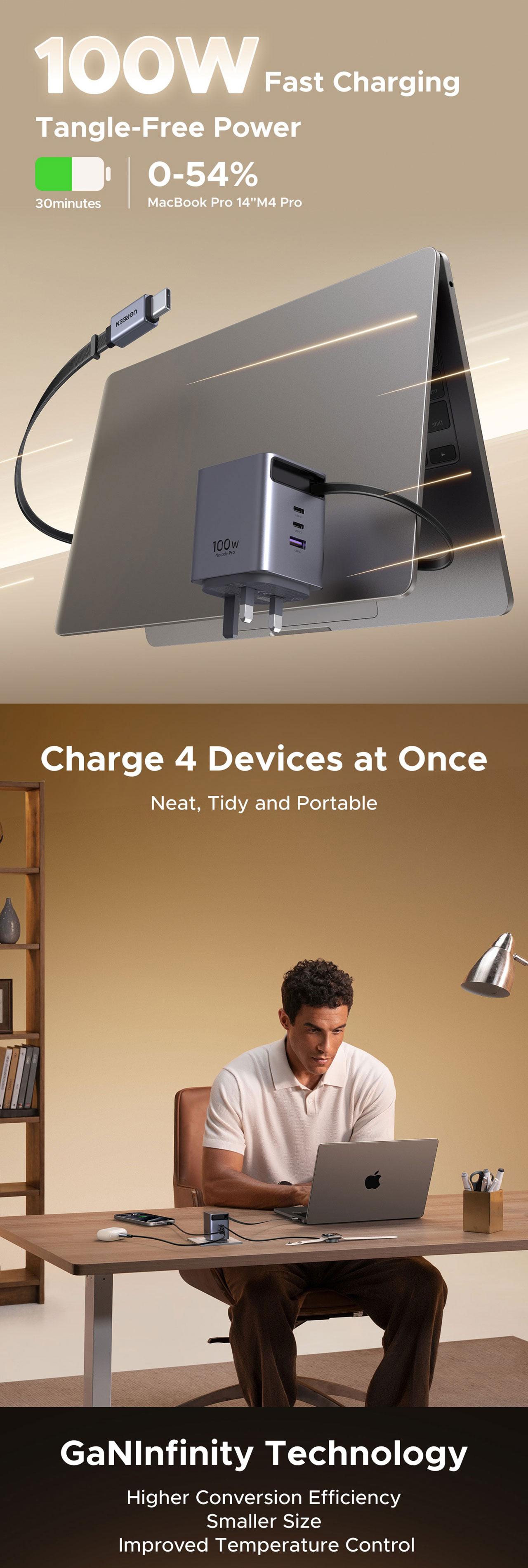 - Single Port: The integrated cable or the top USB-C port can provide the full 100W, enough to charge a MacBook Pro 16" to 42% in 30 minutes.