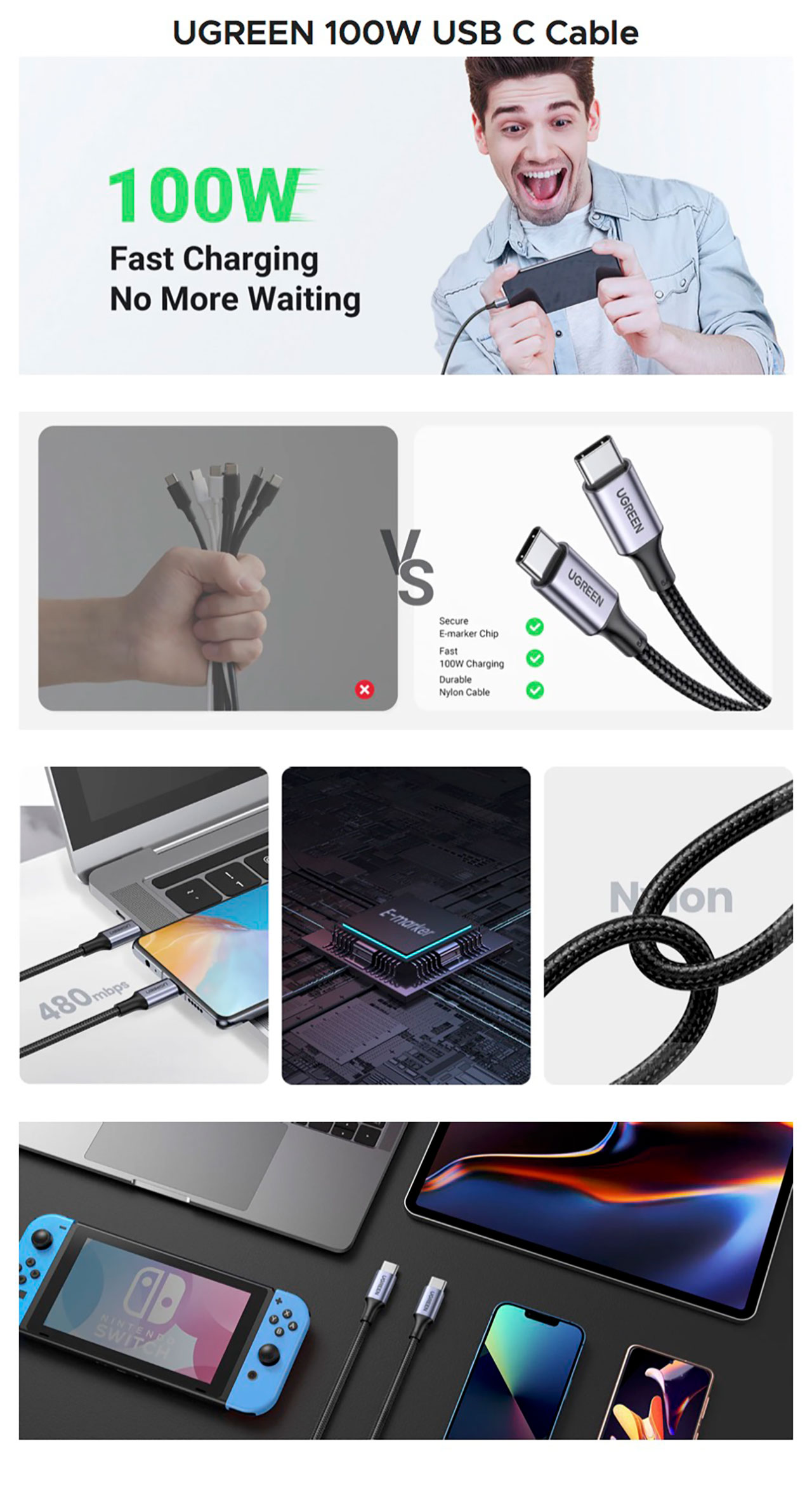 UGREEN 100W USB-C TO USB-C 1.0M CABLE - BLACK - US316 70427