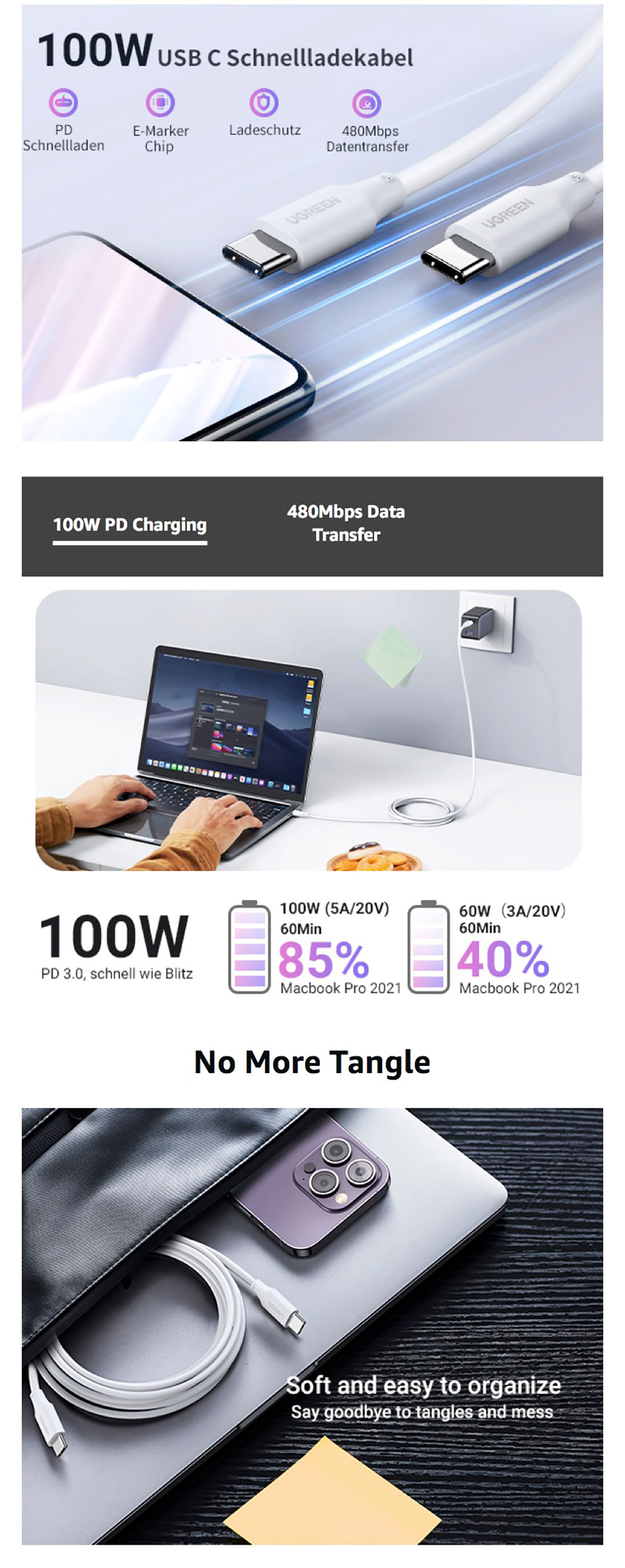 UGREEN 100W USB-C TO USB-C 1.0M CABLE - WHITE - US300 60551