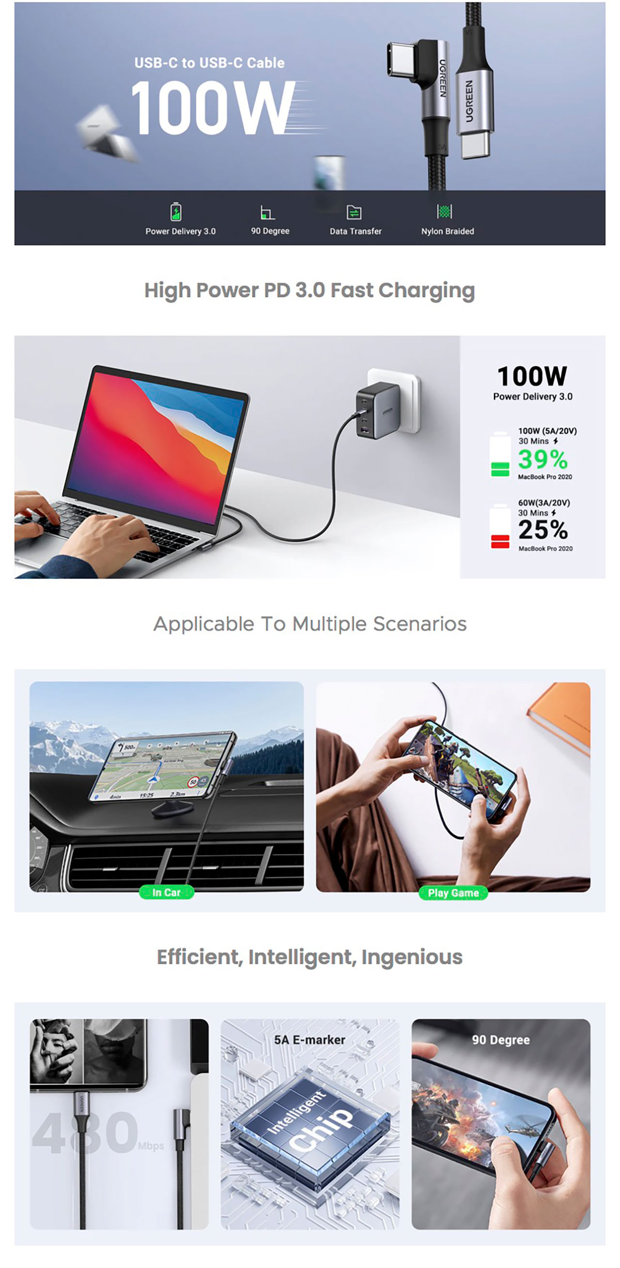 UGREEN 100W USB-C TO USB-C 2.0M L CABLE - US334 70645
