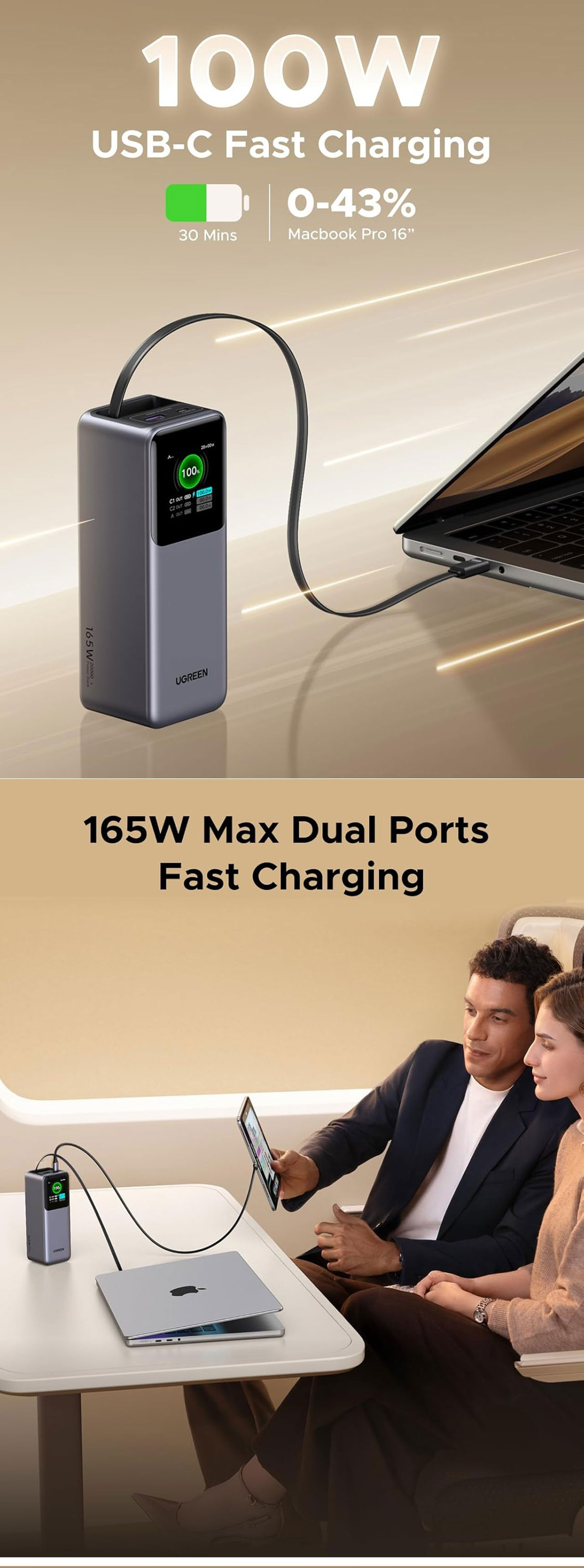 The UGREEN Nexode 20,000mAh 165W Power Bank (PB726 / 95670B) is a high-performance portable charger specifically designed for power users who need to charge laptops and multiple mobile devices simultaneously. This "CCC Certified" version meets mandatory safety and quality standards in China (3C), ensuring reliable performance.