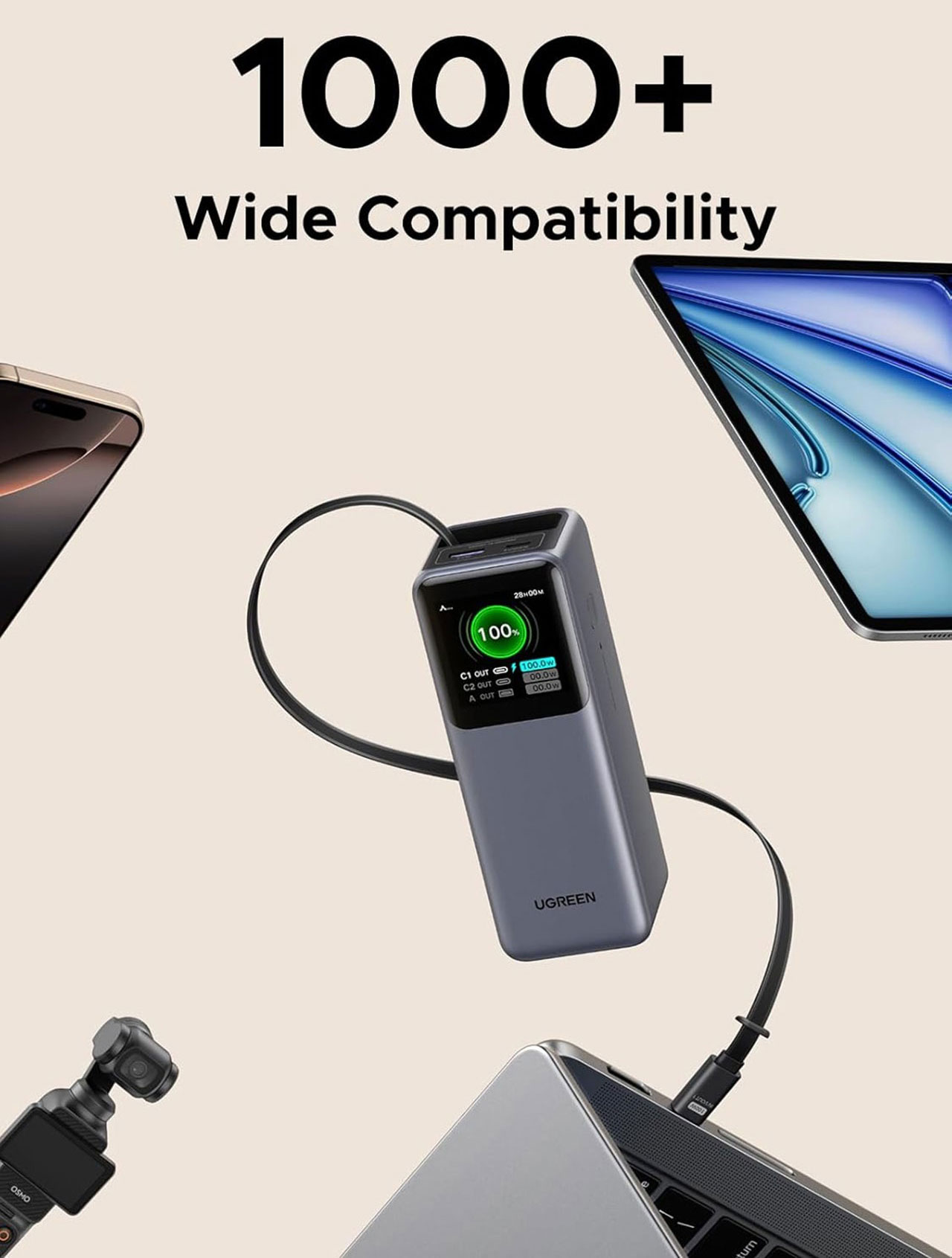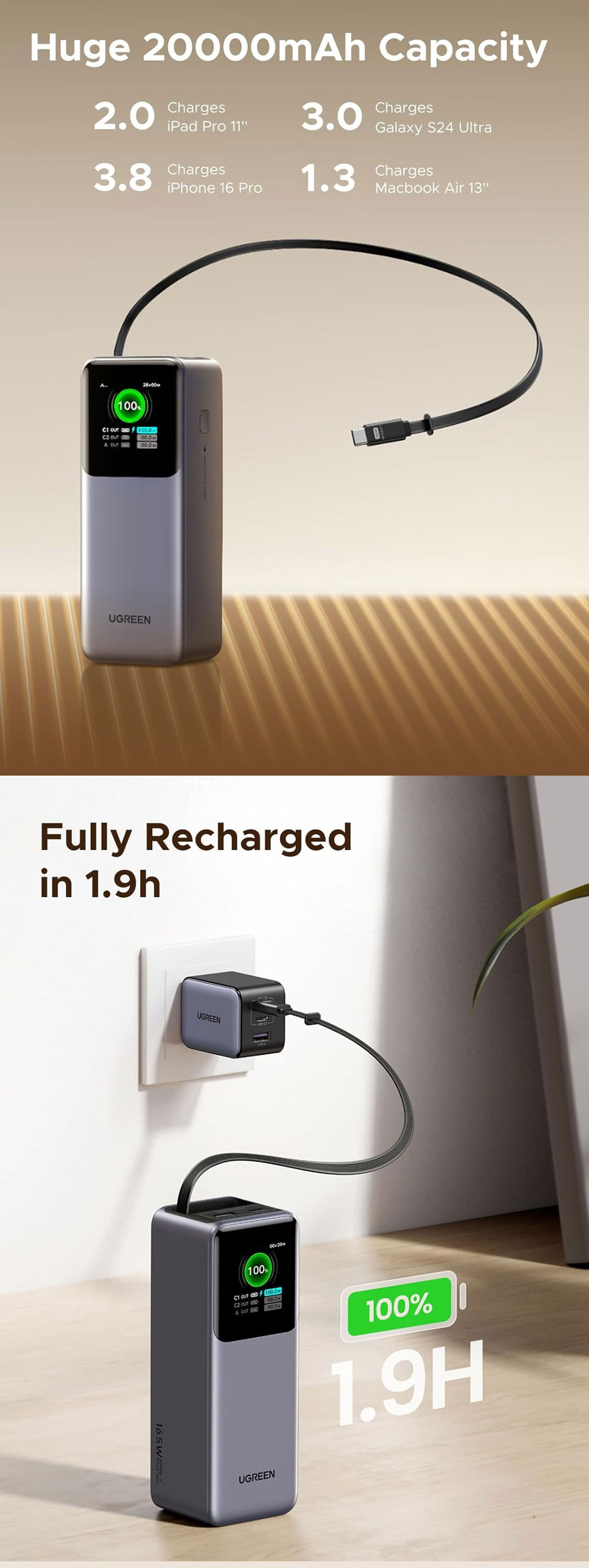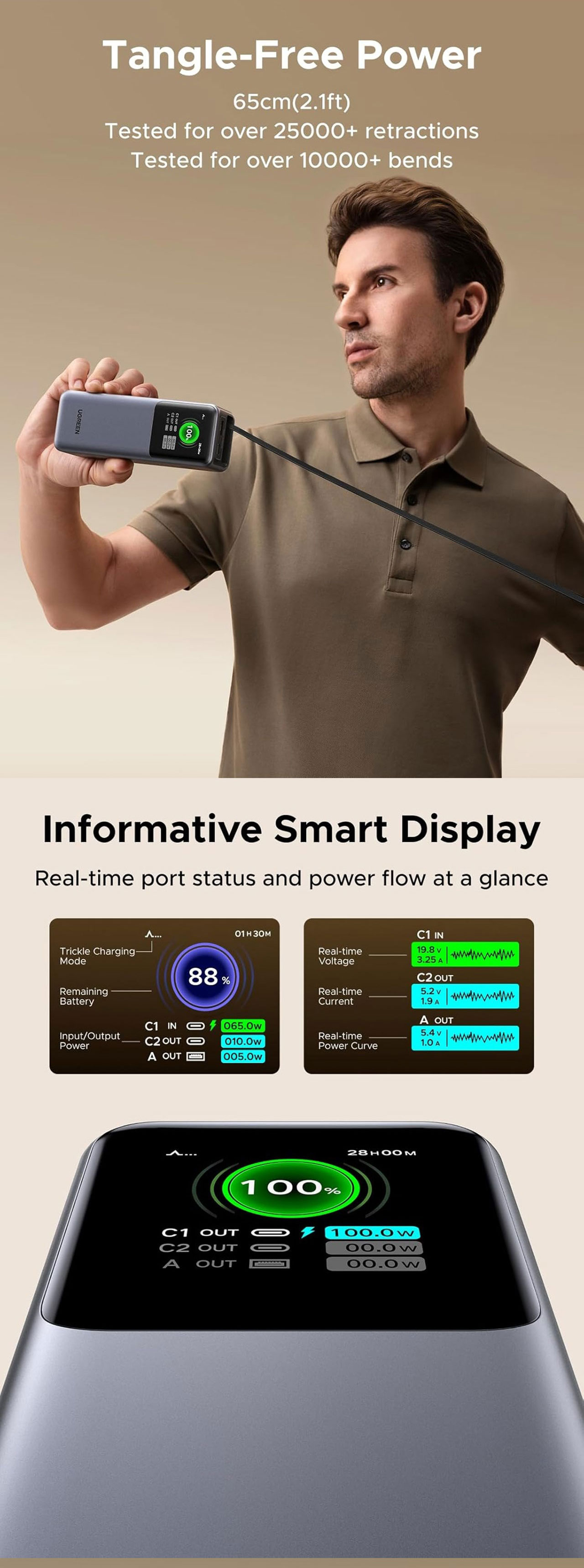- Built-in Cable: Includes a 65cm (25.6-inch) retractable USB-C cable that supports up to 100W output.