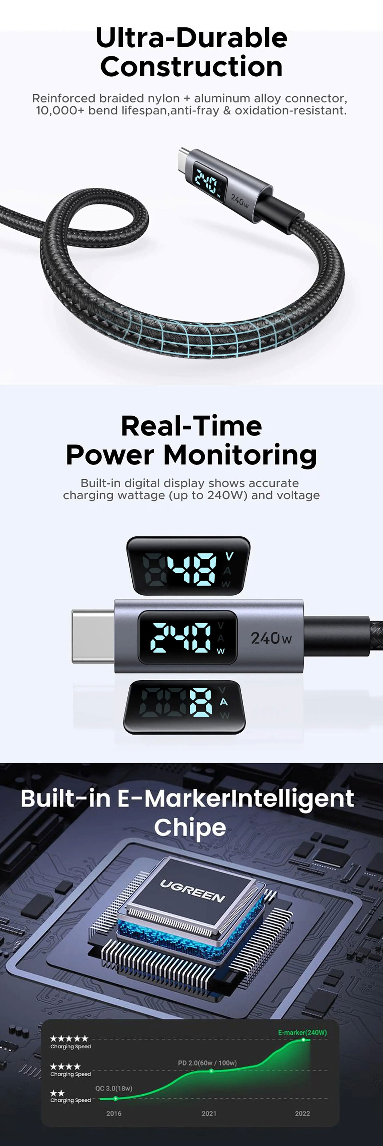 The UGREEN 240W USB-C to USB-C 2.0M Cable with Display (Model L530 / SKU 65867) is a high-power charging and data cable featuring a built-in digital screen to monitor power delivery in real-time.