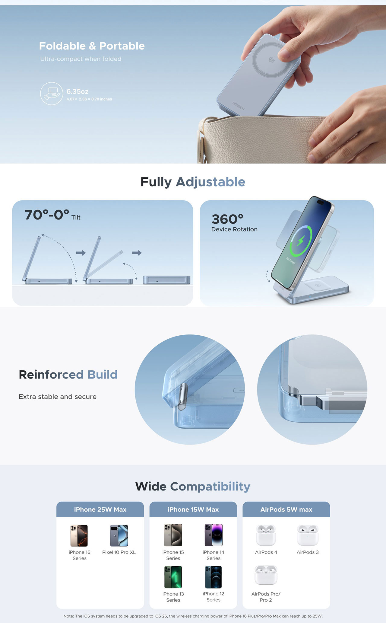 The UGREEN MagFlow 2-in-1 Magnetic Wireless Charging Stand (W756 / 55963) is a Qi2.2-certified fast charger designed to simultaneously power an iPhone and AirPods. It is part of UGREEN's MagFlow series, featuring a compact, foldable design optimized for both desk use and travel.