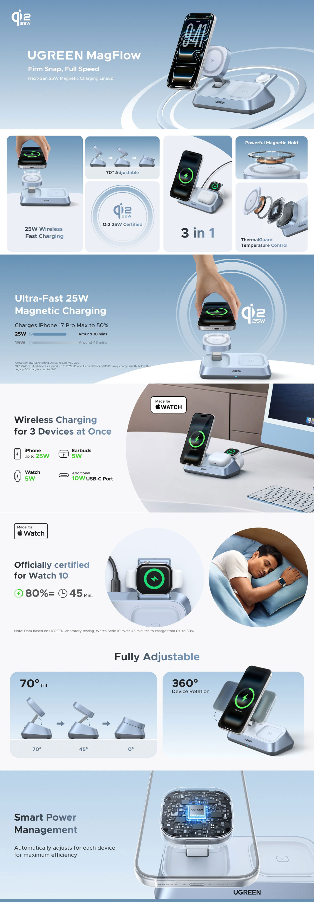 The UGREEN 3-in-1 MagFlow Wireless Charging Stand (Model: W711 / 55678) is a foldable, Qi2-certified charging station designed to simultaneously power an iPhone, Apple Watch, and AirPods. It features high-speed 25W wireless charging for compatible iPhones and is built with a premium aluminum and PC/ABS body.