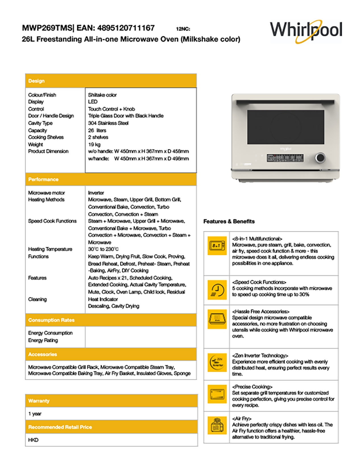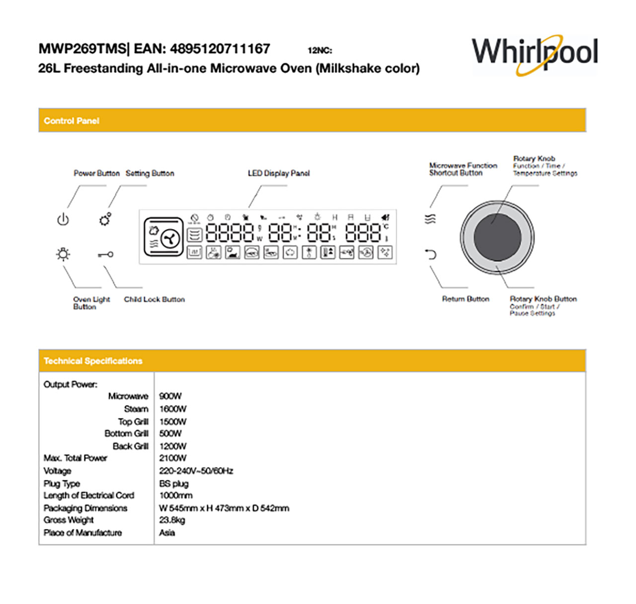 WHIRLPOOL AIO MICROWAVE OVEN 26L MWP269TMS