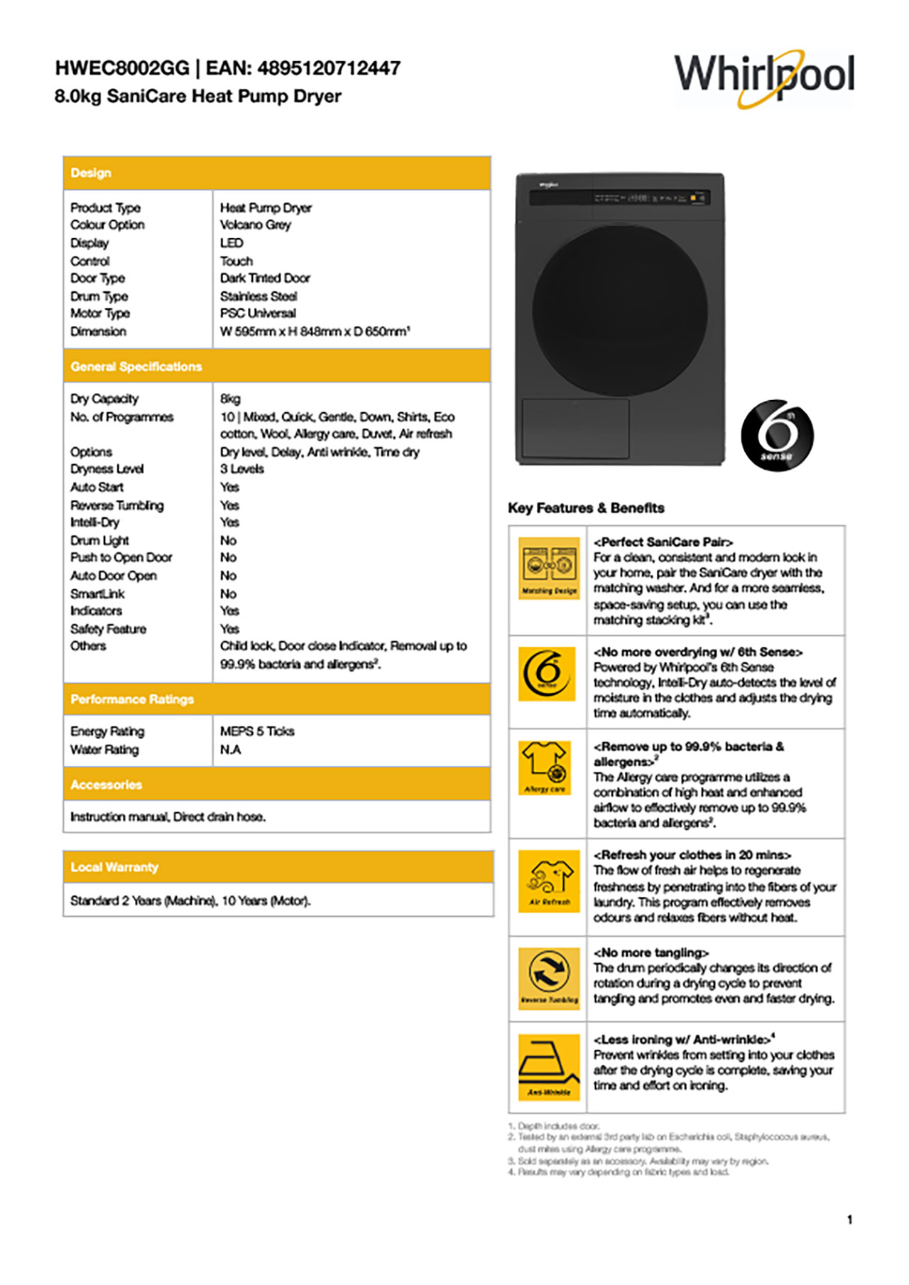 WHIRLPOOL HEAT PUMP DRYER HWEC8002GG