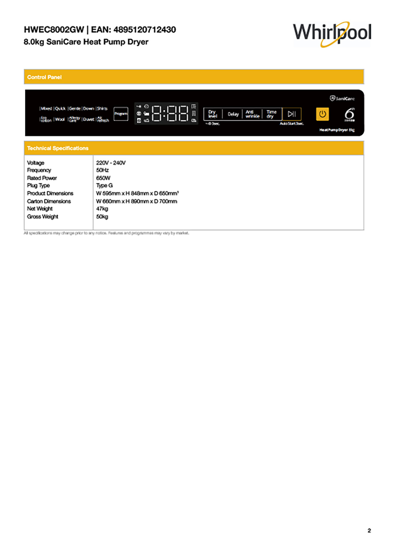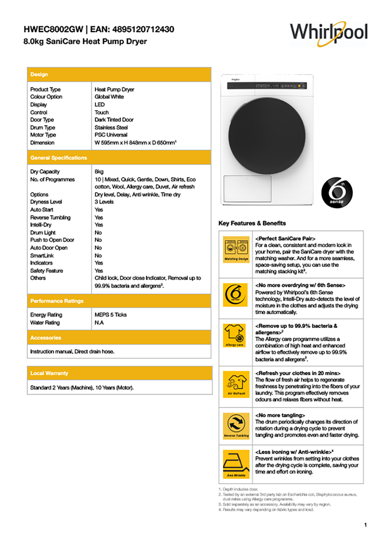 WHIRLPOOL HEAT PUMP DRYER HWEC8002GW