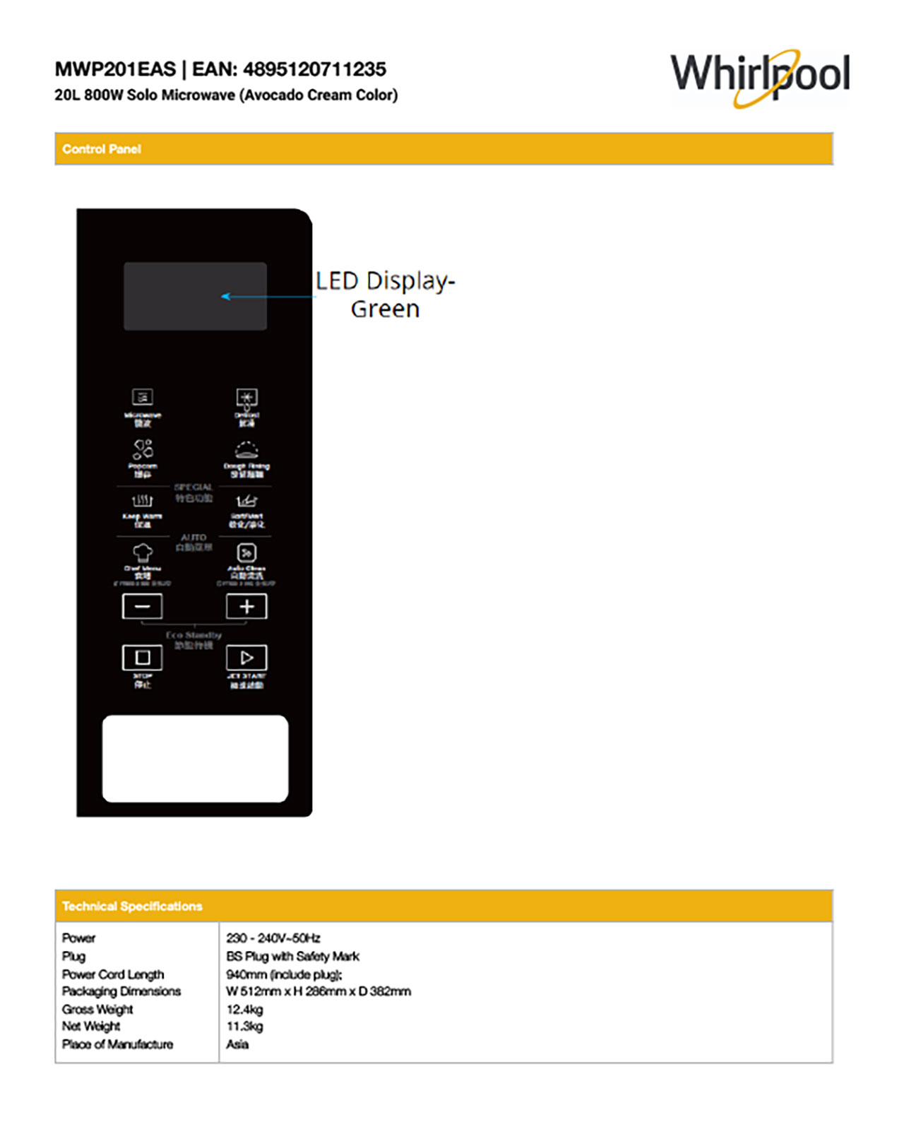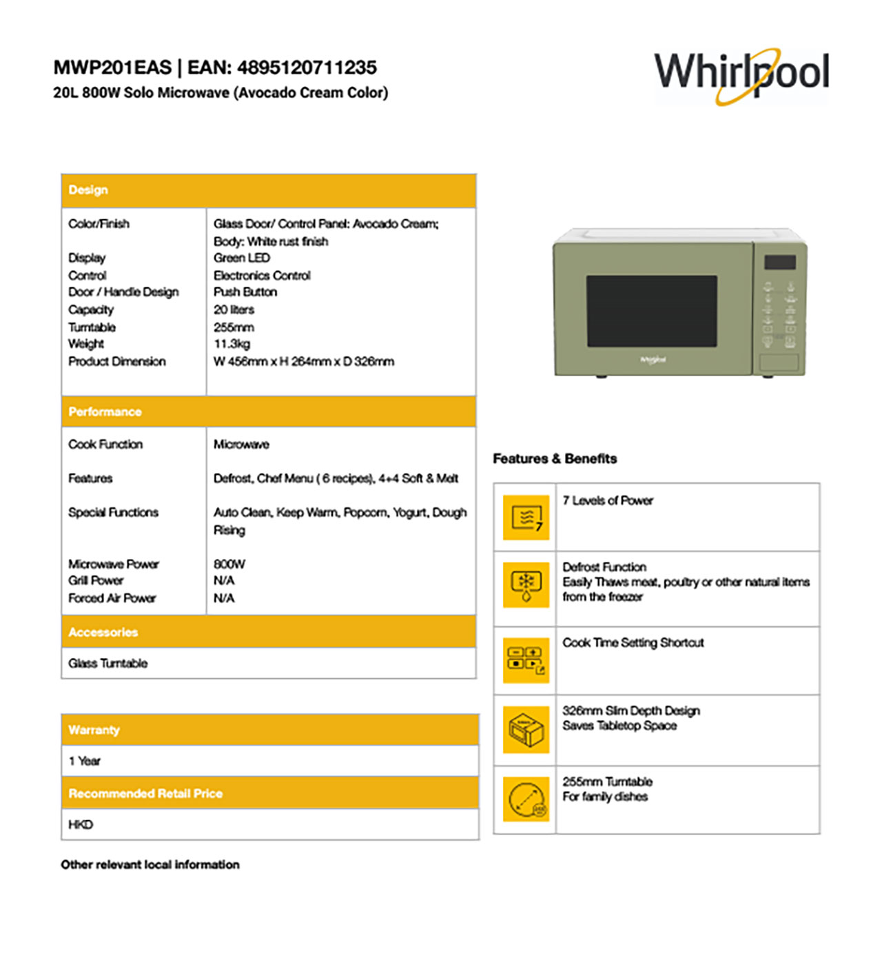 WHIRLPOOL MICROWAVE OVEN 20L MWP201EAS