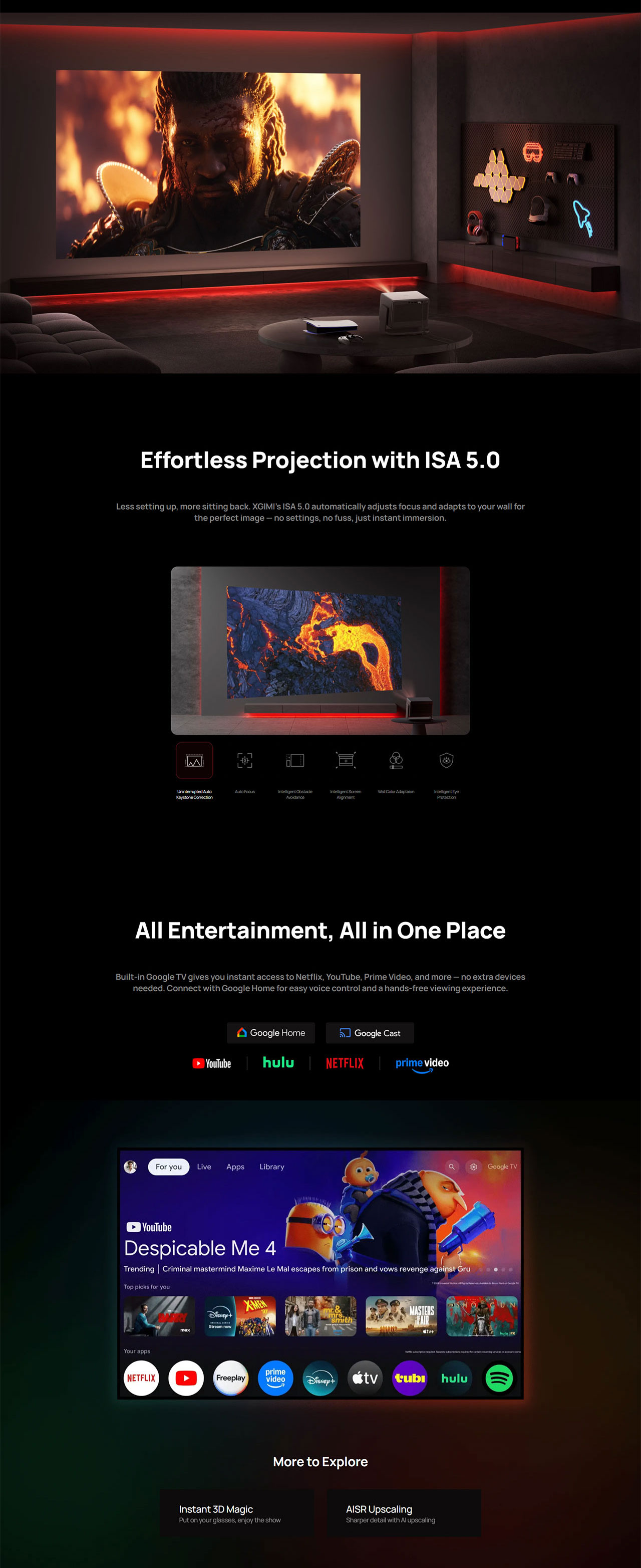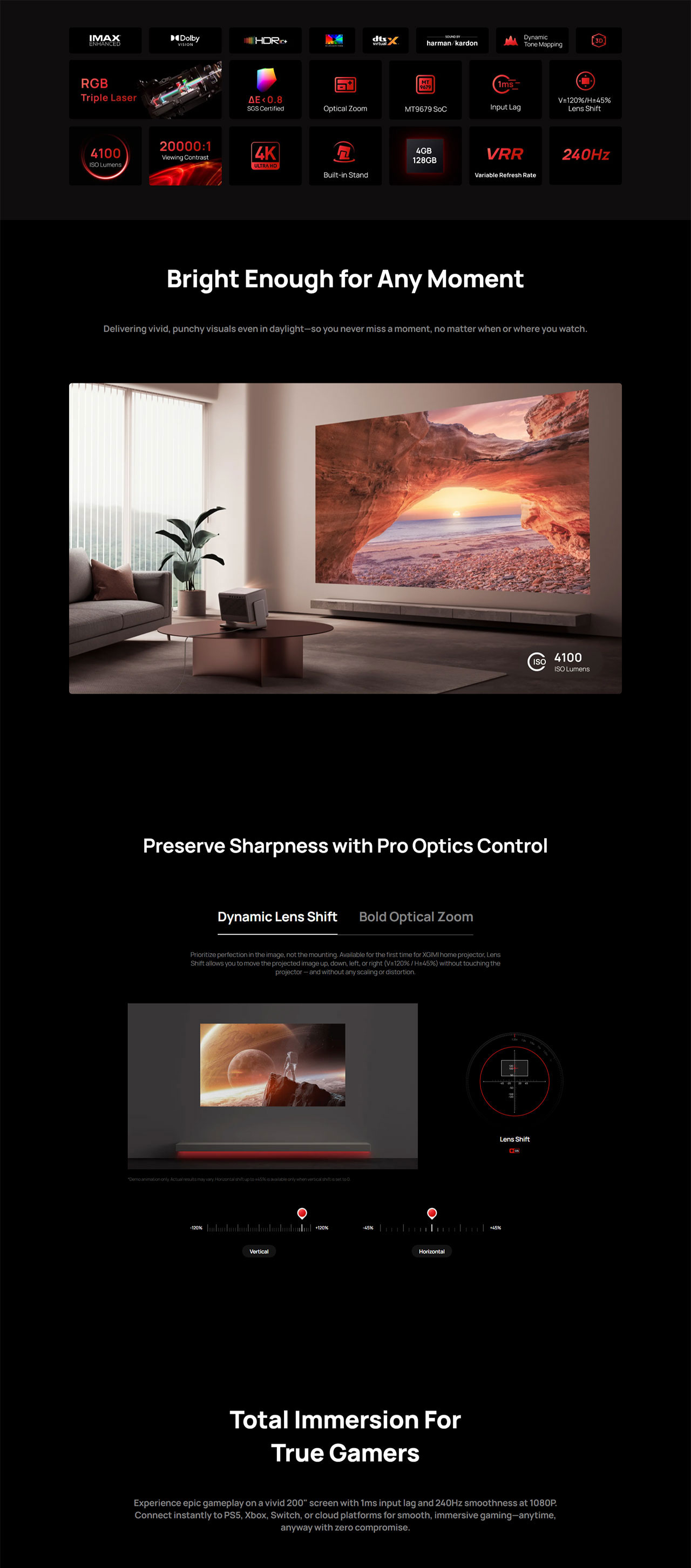 - Lossless Optics: Flexible lens shift and optical zoom give you more freedom in setup—without sacrificing clarity. Enjoy crisp, distortion-free visuals at any size, from any angle.